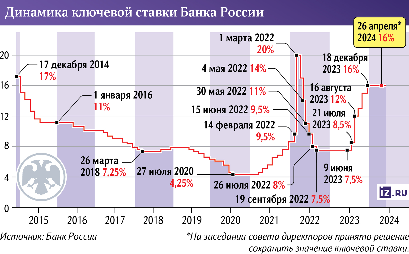 Когда ЦБ начнет снижать ключевую ставкуНа заседании 26 апреля ЦБ также рассматривал вариант повышения ставки до 17%. Участники обсуждения отмечали, что при альтернативном сценарии дефицит трудовых ресурсов может усилиться, а рост зарплат — еще больше ускориться, что опять же разгонит инфляцию. В Банке России также уточнили, что спрос государства на определенные товары растет, но при этом он меньше реагирует на динамику ключевой ставки.