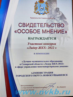 Новокуйбышевск получил Свидетельство "Особое мнение" по итогам конкурса «Лидер ЖКХ-2022» Наш городской округ неоднократно становился победителем конкурса "Лидер ЖКХ" в номинации "Лучшее муниципальное образование Самар