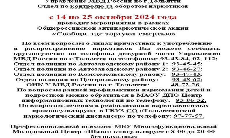 Управление МВД России по г.Тольятти — отдел по контролю за оборотом наркотиков с 14 по 25 октября проводит мероприятия в рамках Общероссийской антинаркотической акции «Сообщи, где торгуют смертью». Важно отметить, что каждый гражданин может внести свой вклад в борьбу с наркотиками, сообщив о фактах торговли ими.