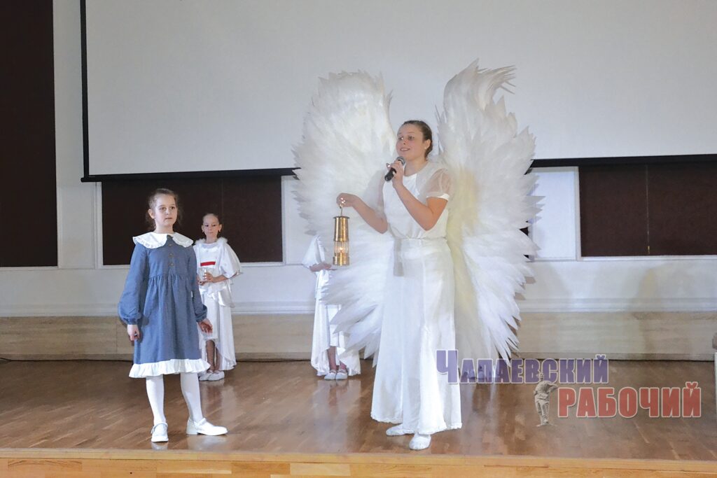 Участники театральной студии школы представили зрителям постановку о трех огнях, символизирующих веру, надежду и любовь. По авторскому замыслу они начали терять свою силу и угасать, но ангел, ниспосланный с небес, смог разжечь пламя вновь.
