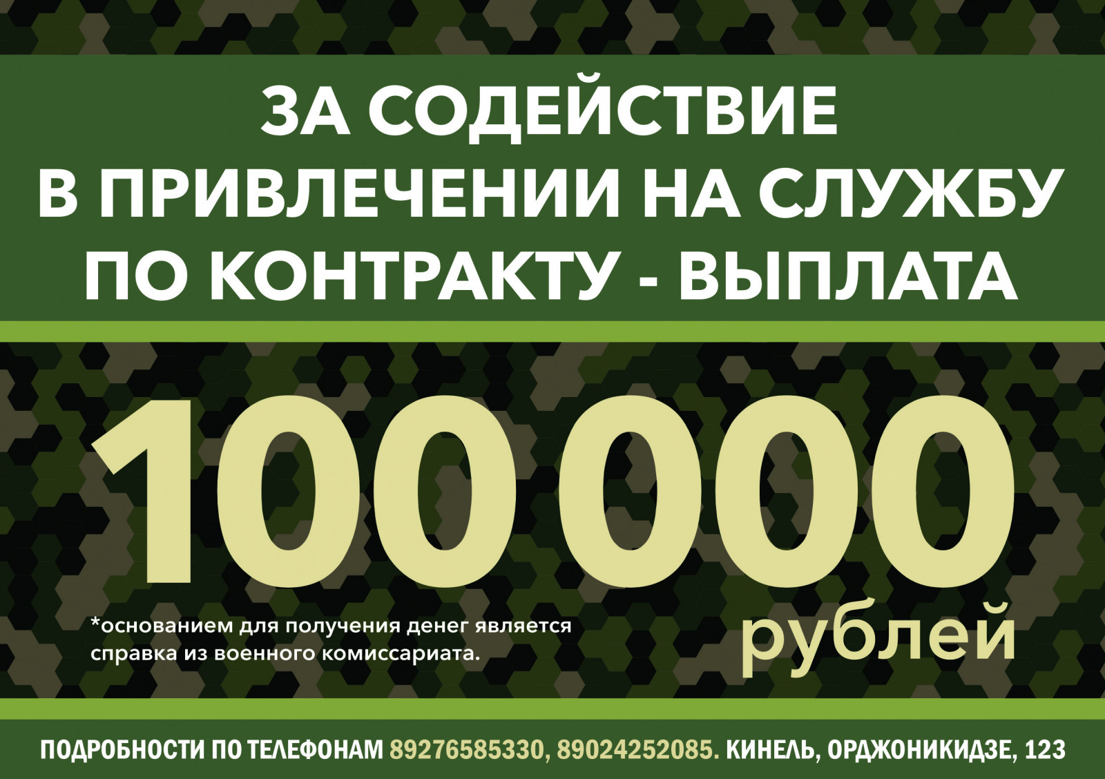 В Самарской области увеличена выплата для жителей, оказавших содействие в проведении агитации и помощь в прибытии кандидата в военный комиссариат или пункт отбора для заключения воинского контракта, и составляет 100 тысяч рублей.